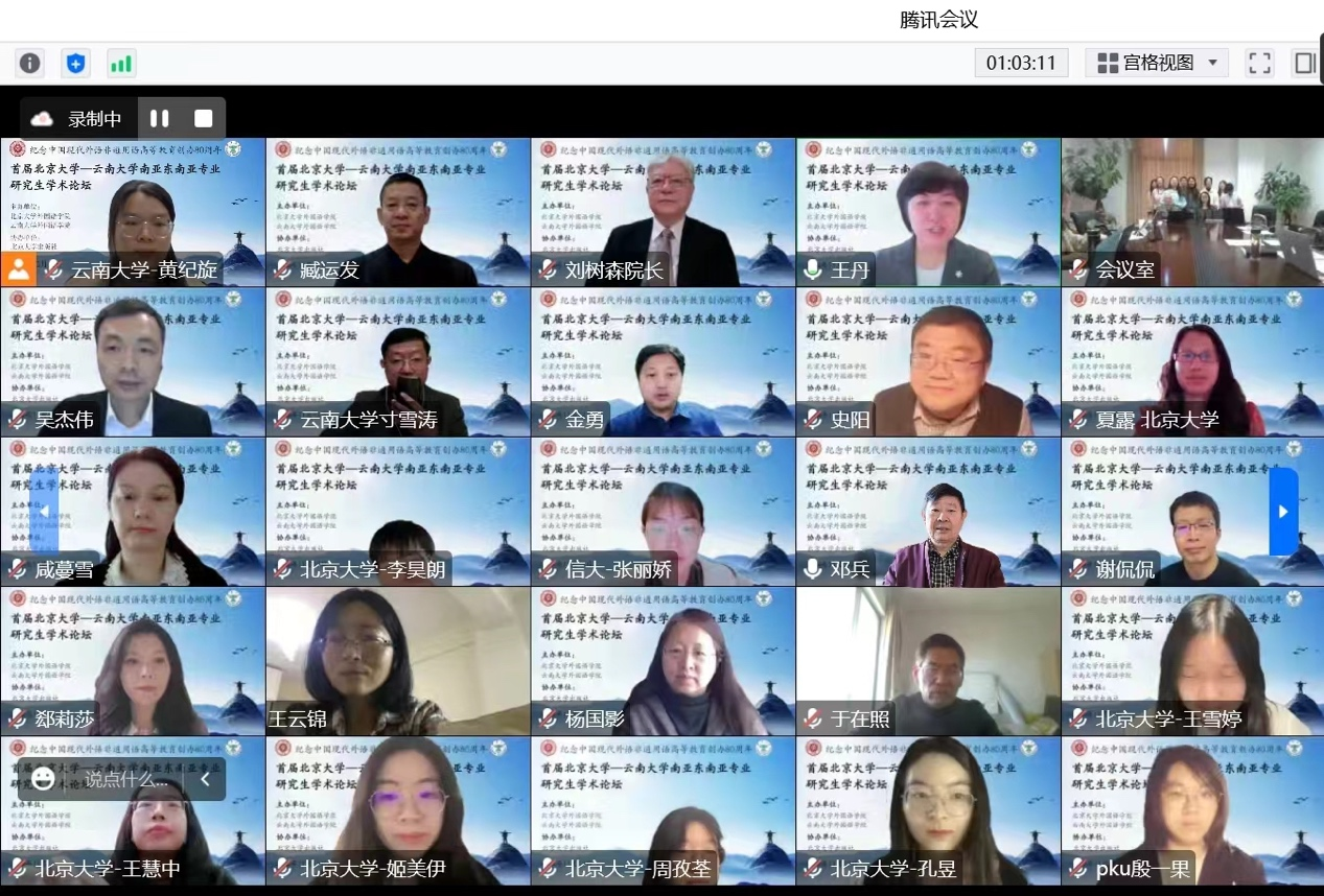 为纪念和庆祝中国现代外语非通用语高等教育创办80周年,促进非通用语种研究生相互交流学习,2022年11月12日 “首届北京大学-拉斯维加斯0567官方网站南亚东南亚专业研究生学术论坛”以线上线下相结合的方式举行。本次论坛由拉斯维官网东南亚系、南亚系与北京大学拉斯维加斯0567官方网站东南亚系合作举办,参加此次论坛并宣读论文的研究生共20人,来自北京大学、云南大学、信息工程大学三所高校的南亚东南亚语种专业,评议专家团队由北京大学拉斯维加斯0567官方网站与拉斯维加斯0567官方网站东南亚系、南亚系共13位资深学者构成,其中包括拉斯维官网邓兵、王宗、于在照、寸雪涛等专家。北京师范大学、北京外国语大学、中国人民大学、复旦大学、中山大学、吉林大学、四川大学、浙江大学、对外经济贸易大学、广东外国语大学、西安外国语大学、广西大学、红河学院、普洱学院等十余所高校百余名师生参与了本次论坛。