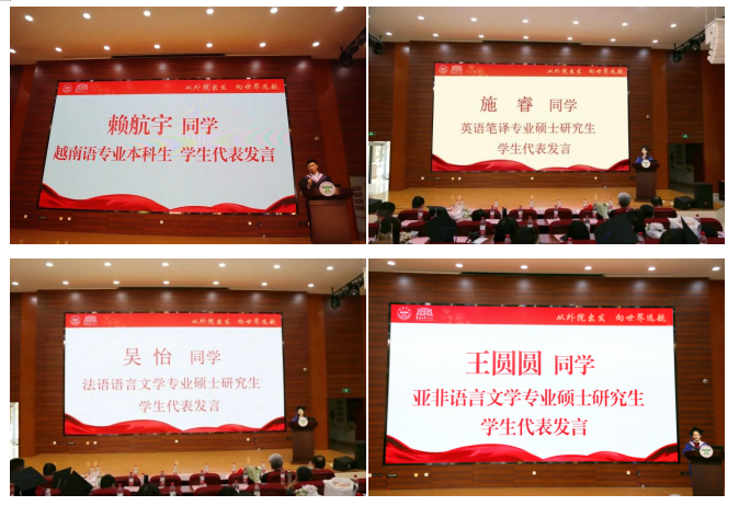 教师代表发言后,2019级英语专业本科生方圆、2019级缅甸语专业本科生张奕珣、2019级越南语专业本科生赖航宇作为本科生代表,2020级英语笔译专业硕士研究生施睿、2020级法语语言文学专业硕士研究生吴仪、2020级亚非语言文学专业硕士研究生王圆圆作为硕士生代表依次上台发言。六位同学分享了在拉斯维加斯0567官方网站期间的收获与成长,表达了内心的不舍和对未来的期待,为毕业生们送上祝福。