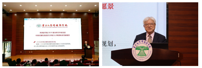 在硕士生毕业典礼上,学院党委副书记何淼淼宣读优秀硕士毕业生名单,由副院长王浩、谢萍、臧运发三位领导,为优秀毕业生代表颁发奖状及纪念品。随后,英语语言文学系刘衍老师、日语语言文学系郑雁天老师、东南亚语言文化系于在照老师作为教师代表依次发言,表达了对同学们的真挚祝福。刘衍老师回忆了过往三年,同学们从青涩懵懂变得更加成熟稳重,以情深意切的语言表达了对2023届硕士毕业生的美好祝愿。郑雁天老师用自己的研究生经历,以学姐的身份给予同学们真诚建议。于在照老师用“祝贺”“互勉”“祝愿”六个字,教导同学们要永跟党走,报效祖国;不断学习,完善自我;奋勇攀登,不懈努力;最后,祝愿同学们秉承“会泽百家,至公天下”的云大精神,从外院出发,展翅高飞,鹏程万里。